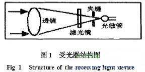 光電傳感器以光為媒介進(jìn)行無接觸檢測。光是一種頻率很高的電磁波[1]。光干擾也算是一種電磁干擾,光干擾是傳感器誤動作的主要因素之一。環(huán)境光、背景光和周圍其它光電傳感器發(fā)出的光是光干擾源。以紅外線為媒介進(jìn)行檢測則可減小可見光的影響,紅外光也不影響可見光。紅外線光電傳感器可用濾光鏡濾去可見光。對于周圍環(huán)境其它光電傳感器的光干擾,可用外殼、套筒、夾縫來抑制[2]。圖1是一種受光器結(jié)構(gòu)圖。