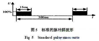 電磁兼容設(shè)計靠電磁兼容試驗來驗證與改進(jìn)。現(xiàn)在,有了比較完善的電磁兼容試驗方法和專門的試驗設(shè)備。開關(guān)電器動作時,形成強(qiáng)烈的干擾,產(chǎn)生瞬態(tài)脈沖。IEC61000-4-4標(biāo)準(zhǔn)對電快速瞬變脈沖干擾作出規(guī)定,分為單個脈沖、一群脈沖、脈沖群。脈沖群波形如圖5所示,周期為300ms,脈沖束寬度為15ms。