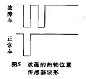 通過(guò)圖4還能看出曲軸位置傳感器波形出現(xiàn)2次才與凸輪軸位置傳感器波形重合一次起始位置,這種關(guān)系和本車曲軸轉(zhuǎn)速與凸輪軸轉(zhuǎn)速比為2:1的關(guān)系一致,也正好是1缸上止點(diǎn)的位置,也就是1缸點(diǎn)火正時(shí)的基準(zhǔn)位置,也決定了其它3個(gè)缸的點(diǎn)火時(shí)刻。此信號(hào)傳輸給腳,ECU就能發(fā)出點(diǎn)火信號(hào),起動(dòng)發(fā)動(dòng)機(jī)。否則ECU就不發(fā)出點(diǎn)火信號(hào),發(fā)動(dòng)機(jī)不能起動(dòng)。