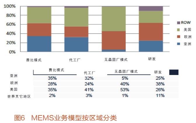 目前,MEMS業務的主體按地區有不同的側重,亞洲主要是制造,世界其它地區以研發為主(圖6)。