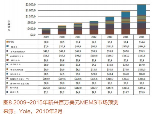 Yolo給出了MEMS的新興和衰落圖(圖7),以及2009-2015年間新興百萬美元價值MEMS預測(圖9)。