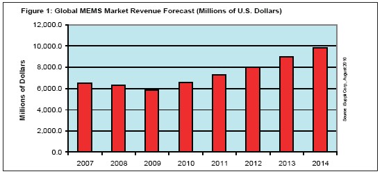 預(yù)計(jì)今年MEMS市場(chǎng)將增長11 .1%,達(dá)到65.54億美元,略高于2007年創(chuàng)下的高點(diǎn)65.50億美元。該市場(chǎng)之前兩年呈下降態(tài)勢(shì),是其較短歷史中的首次下降,2008年銷售額下降到63億美元,2009年進(jìn)一步降到59億美元。