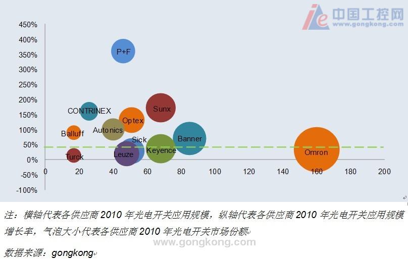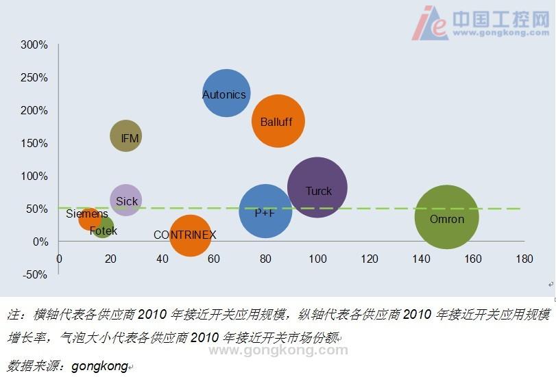 據(jù)gongkong《2011年中國離散傳感器市場研究報(bào)告》數(shù)據(jù)顯示,2010年離散傳感器市場迎來高速增長,市場規(guī)模達(dá)到34.5億人民幣,同比去年增長43.7%,其中光電開關(guān)和接近開關(guān)的增長幅度都超過了50%,編碼器增長幅度也超過40%,皆為2007年以來的最高水平。
