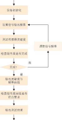 壓電式爆震傳感器的線性度檢測主要通過連續(xù)改變振臺的振動頻率,即采用掃頻的方式,將振臺的振動加速度穩(wěn)定在設(shè)定范圍內(nèi),對各個頻率下的傳感器靈敏度進行檢測,輸出各個靈敏度與頻率相對應(yīng)的連續(xù)曲線,并檢測該曲線是否符合該傳感器產(chǎn)品的線性度要求,其測試流程如圖1所示。