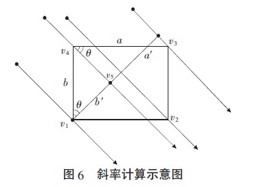 同時初始設置時可以根據虛擬觸摸屏的長寬和每個棋盤格在圖像上的投影確定攝像頭拍攝的每個棋盤格平行光的斜率。放大圖5 中的棋盤格s,得到圖6。假設攝像頭c1以斜率k平行拍攝由頂點v1、v2、v3、v4組成的棋盤格s,其邊(v4,v3)的長度為a,在圖像平面上的投影(v3,v5)的長度為a′,其邊(v1,v4)的長度為b,在圖像平面的投影(v1,v5)的長度為b′。已知虛擬觸摸屏的長寬,每個棋盤格的長a 和寬b 分別為其1/n,a′、b′可從拍攝的圖像上獲得,于是從攝像頭拍攝該棋盤格的平行光的斜率k 可由下式獲得: