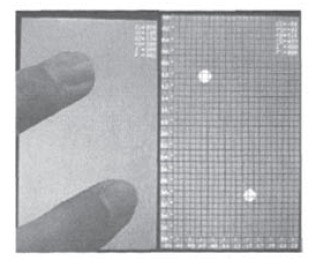 實際電極設(shè)計中,每對感應(yīng)單元設(shè)計為多組電極,并根據(jù)Lens的厚度設(shè)計電極面積以及間隙大小。間隙過大會導(dǎo)致線縫可見,因此使用假電極進行填充使線縫在30μm以內(nèi)則可以避免上述問題。經(jīng)過實際測試,在實現(xiàn)單點觸控基本功能的同時,能夠?qū)崿F(xiàn)兩點觸控,滿足設(shè)計要求。操作效果如圖5所示。