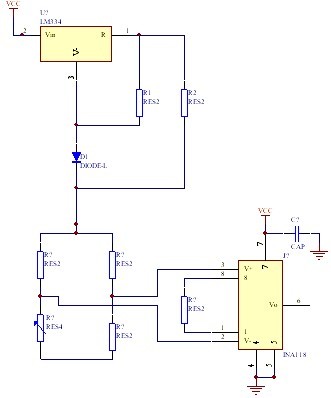 本文采用惠斯通電橋濾出微壓力傳感器輸出的模擬變量,然后用INA118放大器將此信號放大,用7715A/D 進行模數轉換,將轉換完成的數字量經單片機處理,最后由LCD 將其顯示,采用LM334 做的精密5 V 恒流源為電橋電路供電,完成了微壓力傳感器接口電路設計,既能保證檢測的實時性,也能提高測量精度。