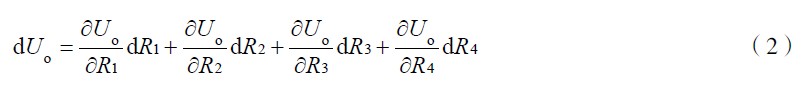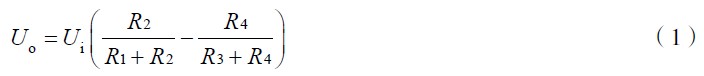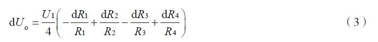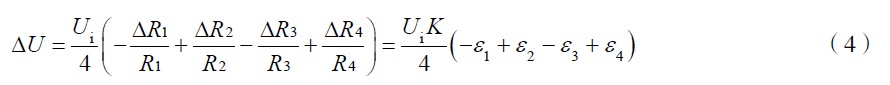 式(4)為電橋轉換原理的一般形式。ΔU 為電橋輸出電壓。作為全等臂電橋,  ΔR1 = ΔR2 = ΔR 3= ΔR4 ,式(4)變為ΔU =UKε 。