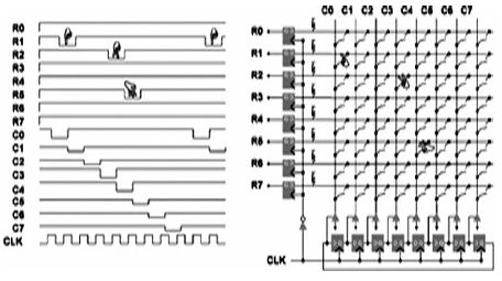 如圖8 所示,8×8 數字電阻觸摸屏, 基于Altera 解決方案[1]:它采用兩層ITO 分別作為水平的sensing line(觸摸感測線)和垂直的driving line(加電驅動線),driving line 和sensing line 之間的觸點就相當于一個開關,在未接觸時,它們之間是絕緣的,而接觸發生后,兩者發生短路,相當于開關閉合。驅動的時候,其中sensing line 通常由一個上拉電阻施加高電平,同時在driving line 上以一定頻率依次在各列中施加負脈沖電壓,這樣當掃描到觸點所在的那一列時,由于觸點開關閉合,形成直流通路,使得觸點所在行的電壓被拉低,形成一個負脈沖,這樣就檢測到了觸點的位置。由于driving line 是依次掃描,所以可以檢測到多個觸點的位置。