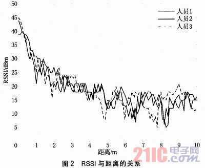 3個工作人員分別拿著移動終端在0~10 m的范圍內(nèi)勻速前進(jìn),得到的RSSI值與距離的關(guān)系如圖2所示。