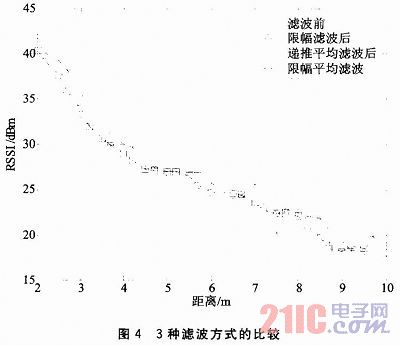 紅外線、GPS和超聲測距都需要額外的硬件,增加了節(jié)點的硬件成本和尺寸。GPS和紅外線測距誤差較大,而利用超聲方法測距很精確,測距誤差只有10 cm,但是受氣溫、濕度等的影響較大,不適合在室外使用?;赗SSI的定位無需額外硬件,利用對接收無線信號的強度判斷,推導(dǎo)收發(fā)節(jié)點間的距離,計算接收無線信號強度是商用無線收發(fā)芯片具備的功能?;赗SSI的測距提供了最廉價的定位方法,而且節(jié)點沒有添加任何部件?;诔暤臏y距雖然定位精度較高,但是需要添加硬件、增加節(jié)點成本和尺寸。所以,基于RSSI的測距是無線傳感器網(wǎng)絡(luò)定位較常采用的方法。首先對RSSI進(jìn)行預(yù)處理,再通過預(yù)測模型預(yù)測距離的值,不但提高了基于RSSI的測距精度,而且實現(xiàn)了低成本的測距。