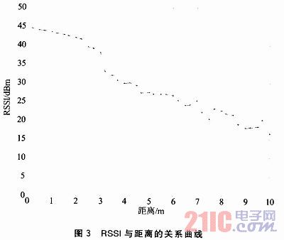在相同的實驗平臺下,在0~10 m的范圍內(nèi),每間隔0.2 m或者0.3 m記錄RSSI值,每個距離均接收100個左右的數(shù)據(jù)包,對RSSI先進(jìn)行均值處理,然后得出RSSI值與距離的關(guān)系曲線如圖3所示。