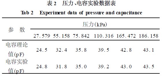 從表1 可見,擬合的電容誤差小于1 %。由此可見,在不同的時刻測得UO ( t) ,通過曲線擬合得出參數RC。再給電路加小信號直流電源,測出R 值,即求得C ,通過C 值則可知被測環境的壓力。圖5為350 ℃時,不同的壓力所對應的電容的理論值和實驗值,從實驗數據(表2) 可得,在測壓的過程中,利用模型識別的方法,誤差較小,其測壓誤差小于2 %。