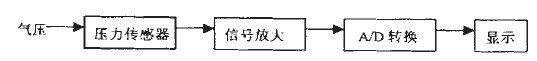 下面以測量輪胎氣壓為例詳細闡述氣壓傳感器在汽車輪胎方面的應用。此種設計可做成一種便攜式的裝置,測量時將氣壓傳感器的表置于輪胎氣門嘴上,這時胎壓作用于傳感器的膜片上, 通過壓阻效應和系列變換輸出微弱的電壓信號,將電壓信號進行相應處理顯示電壓值。由此可知不同的氣壓對應著不同的電壓值,即氣壓值和電壓值是一一對應的,從而間接測量了氣壓值。胎壓測量電路方框圖如圖4所示。