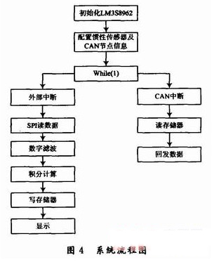 傳統(tǒng)研究方法是先建立數(shù)學(xué)模型,后期采用數(shù)據(jù)處理算法來(lái)糾正誤差。在慣性系統(tǒng)的應(yīng)用中,這不僅要求數(shù)學(xué)模型準(zhǔn)確可靠,而且普通的微控制器由于處理速度限制,而很難處理如此大的數(shù)據(jù)量,采用高性能DSP無(wú)疑增加了成本。為此,設(shè)計(jì)了以LM3S8962為核心處理器,以ADIS16365為慣性傳感器的慣性系統(tǒng)。該系統(tǒng)利用ADIS16365自身的數(shù)據(jù)處理功能對(duì)三軸角速度和角加速度數(shù)據(jù)進(jìn)行處理。在外部再經(jīng)過(guò)濾波與積分,得到了精確的角度信號(hào),滿足了系統(tǒng)的可靠性和。控制要求。此外,面對(duì)系統(tǒng)對(duì)慣性數(shù)據(jù)需求量的增多,將該慣性系統(tǒng)設(shè)計(jì)為一個(gè)CAN節(jié)點(diǎn)應(yīng)用于整個(gè)系統(tǒng)。