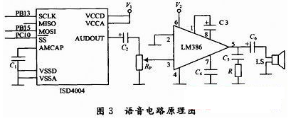 語音電路原理圖如圖3所示,由美國ISD公司的語音芯片ISD4004-16和美國國家半導體公司的音頻功率放大器LM386等元件構成。ISD4004 -16錄放時間為16 min(可分段),它采用CMOS技術,單電源3 V工作,內含振蕩器、抗混疊濾波器、平滑濾波器、音頻放大器、自動靜噪及高密度多電平閃爍存貯陳列。它內置微控制器SPI總線串行通信接口。可將模擬語音數據直接寫入單個存儲單元,不需通過A/D或D/A轉換。使得ISD語音電路具有音質自然、使用方便、單片存儲、反復錄放、低功耗、抗斷電等許多優點。LM386工作電壓范圍寬,電壓增益可調。具有自身功耗低、電壓增益可調整電源電壓范圍大、外接元件少和總諧波失真小等特點。本設計中STM32F103VC通過SPI2給ISD4004傳送語音信息。圖3中的V1和V2分別經三極管與+3.3 V和+12 V電源相連,三極管的通斷由STM32F103VC的PCI1和PCI2控制,只有在需要語音提示時,才使三極管導通給ISD4004和LM386供電。