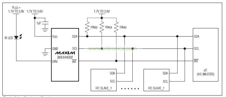 MAX44000設計用于驅動外部IR LED,工作在1.7V至3.6V VDD供電電源。只有環境光傳感器工作時,器件消耗5µA電流,使能接近檢測接收器和驅動器后,器件僅消耗7µA電流。