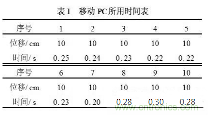現(xiàn)在通過(guò)簡(jiǎn)單實(shí)驗(yàn)獲取數(shù)據(jù)來(lái)計(jì)算人為移動(dòng)引起的az :隨意從桌上拿起筆記本,重復(fù)10次,記錄短距離10 cm)所用時(shí)間。得到10組數(shù)據(jù)如表1所示。