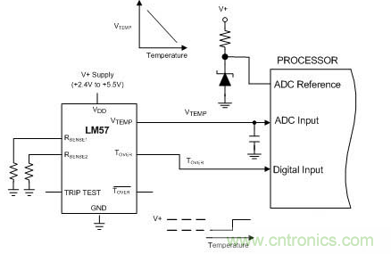處理器的模數(shù)轉(zhuǎn)換器用于采集溫度模擬電壓(VTEMP)。當(dāng)溫度超出臨界值時(shí),過熱(TOVER)輸出端會(huì)驅(qū)動(dòng)處理器的輸入端進(jìn)行指示。跳脫點(diǎn)由兩個(gè)無(wú)源電阻器(RSENSE1和RSENSE2)設(shè)置,而不是由有效參考端和偏壓電阻器設(shè)置。