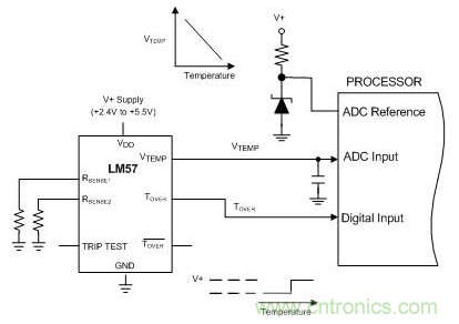LM57完全集成(圖3),所有組成部分的輸入輸出都包含在LM57的校對(duì)流程中,因此不會(huì)產(chǎn)生以上所提到的誤差源。同時(shí),系統(tǒng)設(shè)計(jì)員不需要累加各組成元件的誤差,從而得出總誤差。LM57能保證VTEMP模擬輸出的最大誤差為±0.7℃,TOVER警報(bào)輸出的最大誤差為±1.5℃。