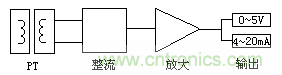 交流信號又分為交流電壓和電流信號。圖1為交流電流信號的檢測原理框圖,圖2為交流電壓信號的檢測原理框圖,由CT和PT對信號進行隔離,電流為穿孔輸入方式,電壓為端子接線輸入方式。