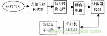 本設計的硬件電路主要由單片機89C51、計數器8253、細分與辨向電路、信號變換電路和光柵位移傳感器組成。如圖1所示。