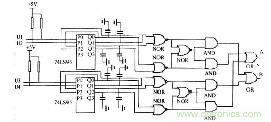位移除了有大小的屬性外,還具有方向的屬性。為了辨別標尺光柵位移的方向,僅靠一個光敏元件輸出一個信號是不行的。必須有2個以上的信號根據他們的相位不同來判斷位移方向。因此,本設計采用的是4個硅光電池來接收莫爾條紋信號,則輸出的4路信號在相位上依次相差90°,利用這種特點設計的辨向電路的如圖3所示。圖中u1,u2和u3,u4分別通過相同的電路實現對位移方向的區別。當莫爾條紋上移時(假設經過硅光電池的前2個,此時u1,u2有信號,u3,u4無信號),則圖中A點有計數脈沖,B點為恒定電平;當莫爾條紋下移時(假設經過硅光電池的前2個,此時u1,u2有信號,u3,u4無信號),則圖中B點有計數脈沖,A點為恒定電平。用2個不同計數器分別記錄上移和下移所形成的脈沖數,即可實現辨向。