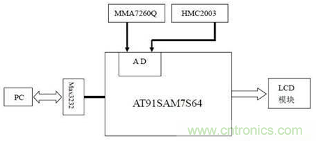 本系統(tǒng)的硬件結(jié)構(gòu)如圖2所示。由于At91sam7s64具有片上A/D轉(zhuǎn)換器而且具有8選1模擬復(fù)用器,使得MMA7620Q和HMC2003可以直接與微控制器相連而不必外加A/D轉(zhuǎn)換器和復(fù)用器,不僅降低了系統(tǒng)的成本和體積,提高了系統(tǒng)的集成度,同時減少了誤差源,提高了精度。經(jīng)過A/D轉(zhuǎn)換的測量數(shù)據(jù)經(jīng)過ARM核的處理后,被送到串口LCD并通過RS232接口送入PC機(jī)進(jìn)行進(jìn)一步的分析。
