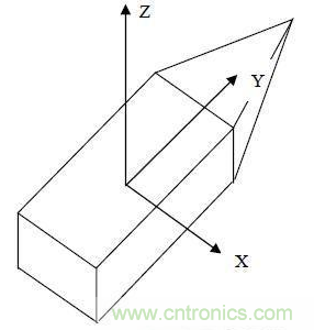 在本系統(tǒng)中,三軸加速度計和三軸MR傳感器都以以下的方式安裝于電路板上:它們的X軸平行于系統(tǒng)的橫軸指向右,Y軸平行于系統(tǒng)的縱軸指向前,X、Y、Z軸定義為右手坐標(biāo)系統(tǒng),如圖2所示。