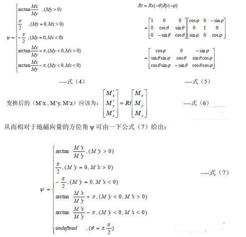 為了獲得系統(tǒng)相對于當(dāng)?shù)氐卮畔蛄康姆轿唤牵枰褂肕R傳感器的三個輸出Mx, My, Mz.當(dāng)系統(tǒng)置于水平狀態(tài)時(俯仰角和橫滾角都為0)時,方位角ψ可以由公式(4)直接給出,但是在大多數(shù)情況下,系統(tǒng)并不是工作在水平狀態(tài),此時地磁場的豎直分量將會影響Mx和My的值,因此不能直接由公式(4)獲得相對于地磁向量的方位角。為了在所有情況下都能獲得正確的方位角,必須將俯仰角和橫滾角考慮在內(nèi),即必須通過以俯仰角和橫滾角為參數(shù)的坐標(biāo)變換,將測得的(Mx, My, Mz)向量變換為與載體坐標(biāo)系有相同方位角的水平坐標(biāo)系下的向量(M‘x , M’y, M‘z),其變換矩陣如公式(5)。