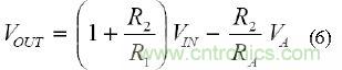 為了找到一個RA值以允許最大失調調整范圍VIN(MAX), 在給定調整電壓范圍VA(MAX)的情況下,使VOUT=0,求RA,結果得到