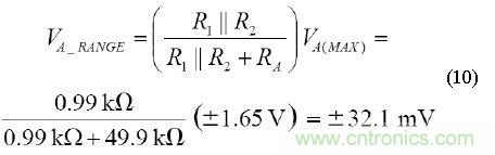 由于DAC可以擺動±1.65 V,因此,總失調調整范圍可通過由RA 以及R1和R2的并聯組合形成的分壓器給定,其計算方法如下: