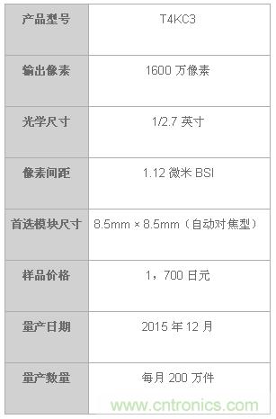 【導讀】東芝宣布推出“T4KC3”,一款1600萬像素并實現低功耗的BSI CMOS圖像傳感器。新產品可降低功耗的低功耗電路設計,在240mW或更低功耗下實現30fps的全分辨率輸出。樣品發貨計劃于今年9月開始。