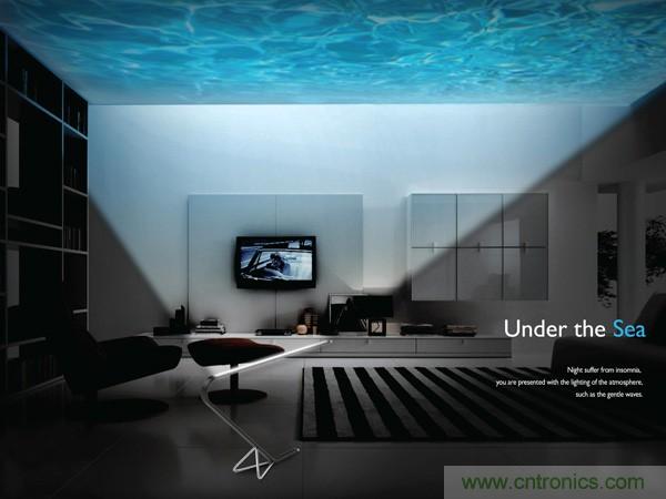 Under The Sea的設計理念,正式希望通過燈光營造一種奇妙的氛圍,幫助你快速進入睡眠。當Under The Sea燈頭朝向天花板時,它可投射出蔚藍平靜的海面,讓我們仿佛置身于海中。而當Under The Sea燈頭朝下時,它又重新回歸正常工作狀態,正常的柔和燈光讓你學習、工作、閱讀都進行的輕松愜意。