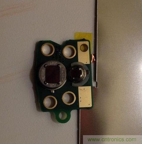用戶可以旋轉(zhuǎn)Nest恒溫器的外圈來選擇選項(xiàng)。這個光電鼠標(biāo)上的發(fā)射器/傳感器組合就是用來檢測旋轉(zhuǎn)的器件。外圈內(nèi)部可以看到光學(xué)鼠標(biāo)元件用來檢測旋轉(zhuǎn)的溝槽圖案。
