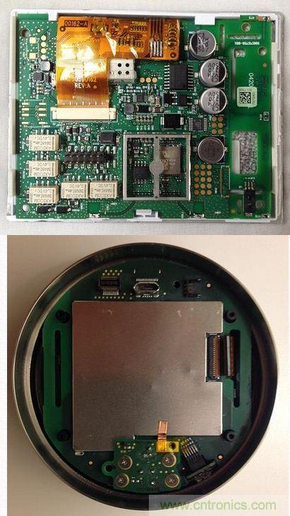 霍尼韋爾恒溫器的單個PCB上包括多個DC-DC轉(zhuǎn)換器、穩(wěn)壓器和整流器、一個8通道12位ADC、128MB SDRAM、32M閃存和博通(Broadcom)Wi-Fi模塊(屏蔽罩移除)。主處理器是愛特梅爾(Atmel)926 ARM處理器,外面包覆了金屬屏蔽罩,僅在扁平帶狀電纜至顯示器下方可見。Nest恒溫器的主要電子元器件全部被包覆在單個屏蔽罩下。靠近底部的兩個附加電路提供檢測功能。PCB與顯示器通過螺絲固定,金屬環(huán)被卡在兩者之間,但可以自由旋轉(zhuǎn)。