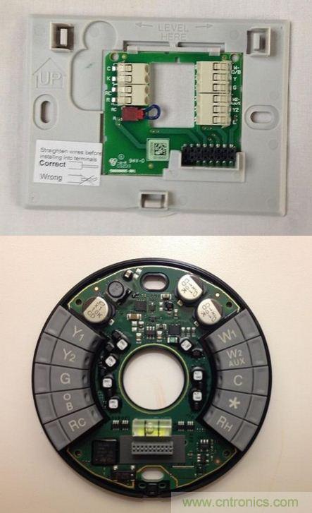 霍尼韋爾恒溫器的入墻式插座是一塊簡單的、帶有暖通空調(diào)(HVAC)單元線纜連接器的雙層PCB。Nest恒溫器的入墻式插座帶有有源器件,包括一個意法半導(dǎo)體(STMicro)STM32L151微控制器和一個8通道模擬多路開關(guān)。插座板中間的氣泡水準(zhǔn)器用于協(xié)助將背板合適地安裝在墻上。