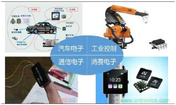 從應用領域來看,工業、汽車電子、通信電子、消費電子四部分是傳感器最大的市 場。國內工業和汽車電子產品領域的傳感器占比約 42%左右,而發展最快的是汽車電子和通信電子應用市場。
