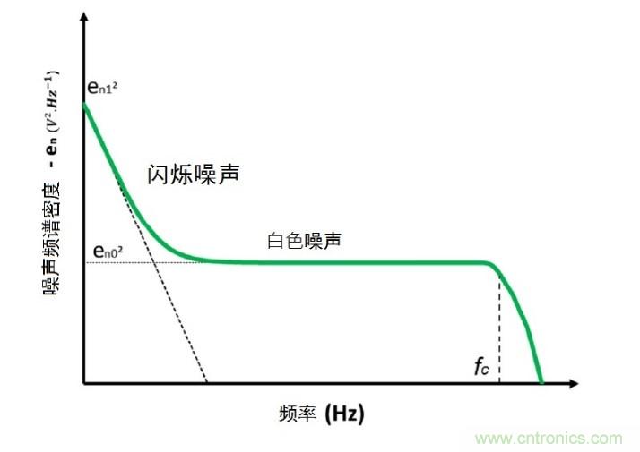 噪聲最由兩個因素造成:1/f閃爍噪聲和熱噪聲(見圖2)。閃爍噪聲是大自然中常有的噪聲,而它旳頻譜密度和地球自轉速度、海底水流、天氣以至氣候現象等活動相關。研究報告顯示普通蠟燭的閃爍速率是1/f 。在MOS器件和放大鏈各元素中,閃爍噪聲則是技術工藝誤差生成的缺陷,使電荷被困于柵極氧化物內所造成的結果。電荷進出這些“陷阱”,造成晶體管通道內的電流不穩定 [6],故又稱「隨機電報噪聲」(random telegraph noise,RTS)。利用洛倫茲數學模型(Lorentzian mathematical model) 可以形容每一個“陷阱”的共振行為,而模型的總和(即MOSFET通道表面范圍的所有“陷阱”總和)在1/f頻譜上展示時,會全完符合具體噪聲的頻譜密度。結果顯示,1/f波幅與MOSFET通道表面面積成反比──而不是完全直觀。