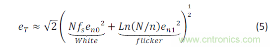 在算式中,fs 是采樣頻率, n是CDS 因子(通常n=2)。如圖3顯示,取決于采樣頻率,這一濾波或多或少地去除1/f噪聲頻率成分,尤其是當采樣頻率fs很高的時候 顯著(換句話說,電荷進出“陷阱”的動作將慢于CDS頻率)。HCDS濾波器結合放大鏈的低通濾波器可以簡化為一個如圖3所示的等效帶通濾波器。圖中的eqBP1 對應一個一級帶通濾波器。這裡eqBP1的噪聲頻譜函數要除以2,以得到一個帶有HCDS函數的等效集成噪聲功率 。eqBP2 是eqBP1的陷波估算值。要取得集成噪聲功率,eqBP2 的上限和下限分別按照下列算式進行倍增: