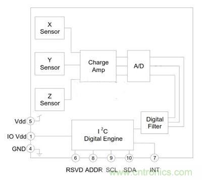 圖2:Kionix公司KXCJ9硅加速度計容納于在從第二貼合晶片在晶片級別創(chuàng)建一個密閉的腔。一個單獨的信號處理ASIC上安裝有傳感元件,以進一步降低傳感器的整體尺寸,產(chǎn)生了3&TImes;3&TImes;0.9毫米的LGA塑料封裝從1.8操作 - 3.6伏直流電源。穩(wěn)壓器用于保持對輸入電源電壓范圍內(nèi)恒定的內(nèi)部工作電壓。這樣,可以通過輸入電源電壓的范圍內(nèi)穩(wěn)定的工作特性,以從供給變異去除任何錯誤,并消除了對外部電源調(diào)節(jié),進一步降低了設(shè)計的整體尺寸。