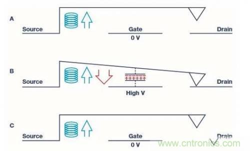 相同的靜電下拉力量可以在平行板電容器中看到,具有會(huì)彼此相互吸引的正電荷板與負(fù)電荷板。 當(dāng)閘極電壓遞增到足夠高的值,它就會(huì)產(chǎn)生出足夠的吸引力(紅色箭頭)來(lái)克服開(kāi)關(guān)梁的電阻彈簧力,而開(kāi)關(guān)梁就會(huì)開(kāi)始下移直到接點(diǎn)碰觸到汲極。 這個(gè)狀況顯示于圖一當(dāng)中的B狀況。 如此就完成了源極與汲極之間的電路,而開(kāi)關(guān)現(xiàn)在是開(kāi)啟的狀態(tài)。 將開(kāi)關(guān)梁往下拉所需的實(shí)際力量與懸臂梁的彈簧常數(shù)以及其對(duì)于移動(dòng)的抵抗力有關(guān)。