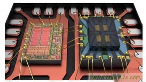 圖四 : 驅(qū)動(dòng)IC(左側(cè)),MEMS開(kāi)關(guān)芯片(右側(cè))被黏著和線焊至金屬導(dǎo)線架上