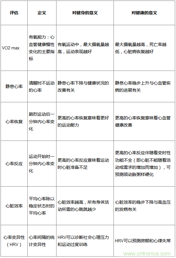 【導讀】在日益數字化的世界中,光學心率傳感器在可穿戴設備中的應用越來越廣泛。這些設備中數不清的應用可提供從個人活動、健身水平到健康狀況的所有內容。精準的生物識別傳感器數據可以提供準確的健身/健康評估,但設計師和工程師究竟能用這些評估做些什么呢?表1總結了目前在健身應用中使用的一些常見評估,這些評估也證明了健康醫療的意義。