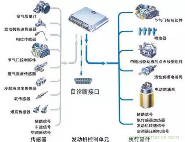 汽車電子控制系統(tǒng)有傳感器、電子控制器(ECU)和執(zhí)行器的組成。在汽車電子控制系統(tǒng)中,傳感器的作用是將被控對(duì)象的相關(guān)參量轉(zhuǎn)換為相應(yīng)的電信號(hào),并輸送給控制器,控制器根據(jù)相關(guān)傳感器的信號(hào)對(duì)被控對(duì)象的工況及狀態(tài)進(jìn)行分析與判斷后,輸出控制信號(hào),通過(guò)執(zhí)行器實(shí)現(xiàn)自動(dòng)控制。電子控制系統(tǒng)分為發(fā)動(dòng)機(jī)電子控制系統(tǒng)、底盤電子控制系統(tǒng)和車身電子控制系統(tǒng)。
