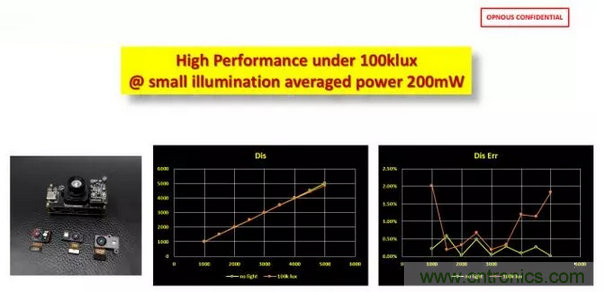 炬佑智能在ToF感知功能方面做了大量的開發(fā),劉洋先生在現(xiàn)場為大家展示了炬佑智能開發(fā)的3D ToF傳感芯片和模組的測試結(jié)果。經(jīng)過炬佑智能自己研發(fā)的智能算法校正后,ToF傳感器在不同背景光的反射率誤差從6%下降到1.4%以下;通過傳感器融合,940nm ToF傳感器在室外的探測精度達到5‰以下;在室外強光環(huán)境下,通過動態(tài)算法的提升,在100klux、照明平均功耗在200mW的水平下,3D ToF傳感模組表現(xiàn)出非常優(yōu)秀的性能。