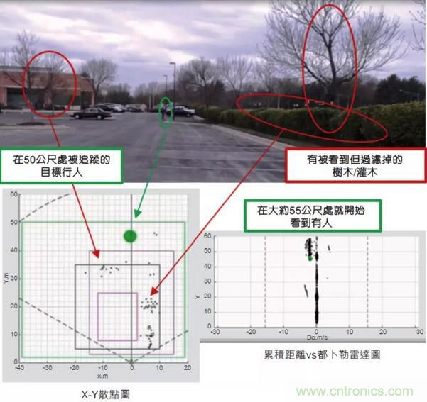 圖1顯示了在一項安防應用中,使用芯片上智能算法在50公尺室外入侵探測器的一項實驗結果。入侵探測器用于確定是否有人進入受保護區(qū)域,例如貨運場、停車場或后院。一些仰賴光學或紅外線感測的探測器,可能會檢測到附近樹木和灌木的錯誤運動。而毫米波傳感器使用處理和算法來濾除和防止錯誤的檢測,僅在人體運動時觸發(fā)探測器。安防攝影機和可視門鈴(video doorbells)可以通過聯(lián)網(wǎng)服務器處理圖像信息,執(zhí)行相同的錯誤檢測過濾;但這些基于服務器的系統(tǒng)所提供的功能通常需要使用者付費,毫米波技術則可實現(xiàn)在傳感器本身進行決策,無需聯(lián)網(wǎng)服務器。