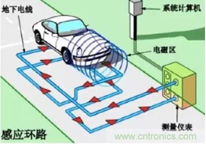 目前,道路檢測交通流狀態用的最多的傳感器件是環形線圈,它可以檢測交通量、車速、占有率、車頭時距、車長、長車比和車輛存在等多個項目。環形線圈檢測原理如圖所示。線圈由專用電纜繞幾匝(一般為4匝)及其饋線構成,它通過一個變壓器接到被恒流源支持的調諧回路,有源環形線圈構成LC調諧回路的電感部分,并在線圈周圍的空間產生電磁場。當含有鐵金屬的車體進入線圈磁場范圍,車輛鐵構件內產生自成閉回路的感應電渦流,此渦流又產生與原有磁場方向相反的新磁場,導致線圈的總電感變小,引起調諧頻率偏離原有數值,從而發出車輛通過或存在的信號。