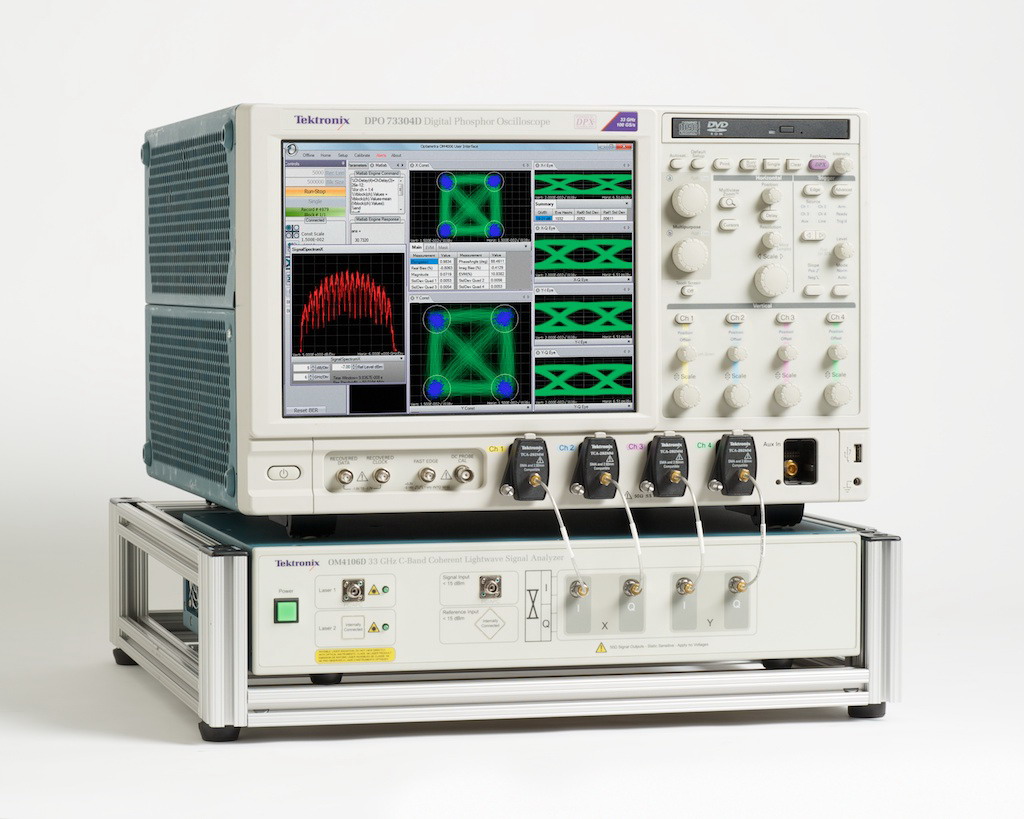 傳統上,光調制分析儀可與許多種示波器機型搭配使用。OM4106D是第一個與高速示波器緊密整合的光調制分析儀,這讓它的性能可以測試市場上速度最快的相干光波系統。DPO73304D示波器提供33GHz實時帶寬,雙通道采樣率為100 GS/s,四通道采樣率為50 GS/s。該示波器還有一個新 DataStore 公共接口,為分析任務提供2倍的從數字轉換器到實現OM4106D算法的 MATLAB 應用的數據吞吐率。