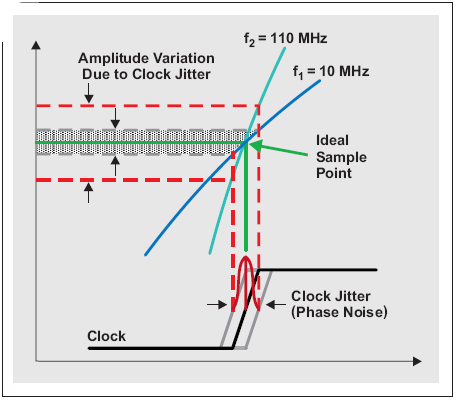 仔細(xì)觀察某個采樣點,可以看到計時不準(zhǔn)(時鐘抖動或時鐘相位噪聲)是如何形成振幅變化的。由于高 Nyquist 區(qū)域(例如,f1 = 10 MHz 到 f2 = 110 MHz)欠采樣帶來輸入頻率的增加,固定數(shù)量的時鐘抖動自理想采樣點產(chǎn)生更大數(shù)量的振幅偏差(噪聲)。另外,圖 2 表明時鐘信號自身轉(zhuǎn)換速率對采樣時間的變化產(chǎn)生了影響。轉(zhuǎn)換速率決定了時鐘信號通過零交叉點的快慢。換句話說,轉(zhuǎn)換速率直接影響 ADC 中時鐘電路的觸發(fā)閾值。